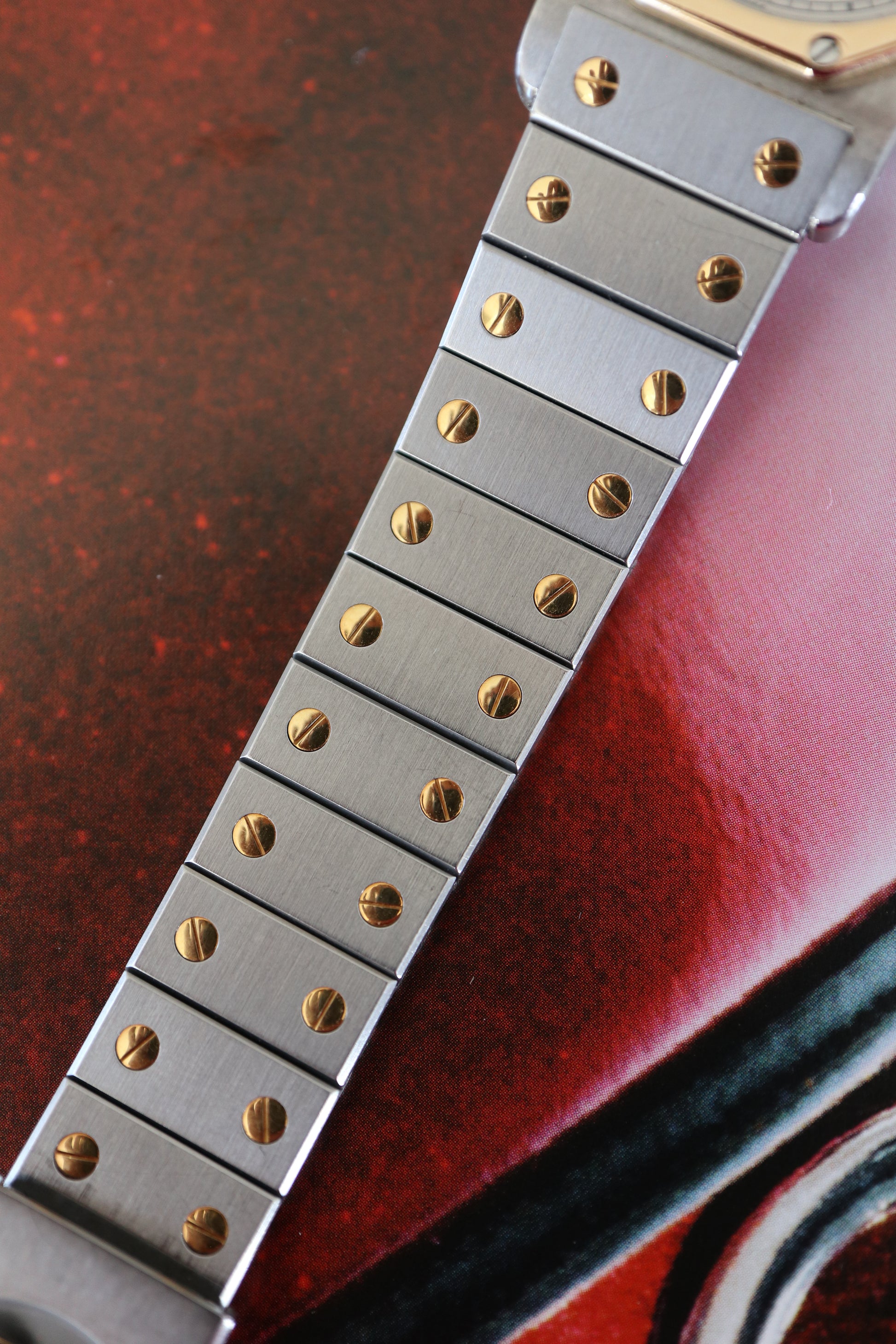 - Case: 30 × 38 mm stainless steel with solid 18K yellow-gold bezel and screws