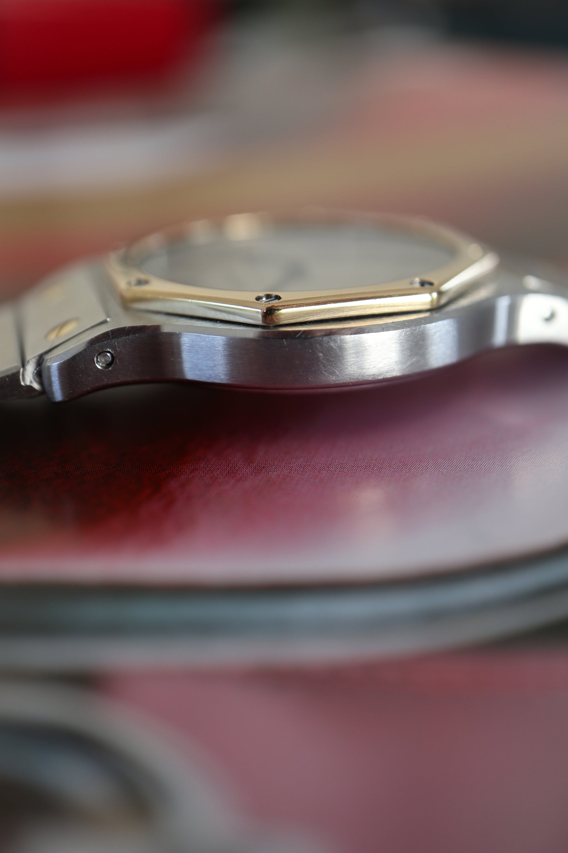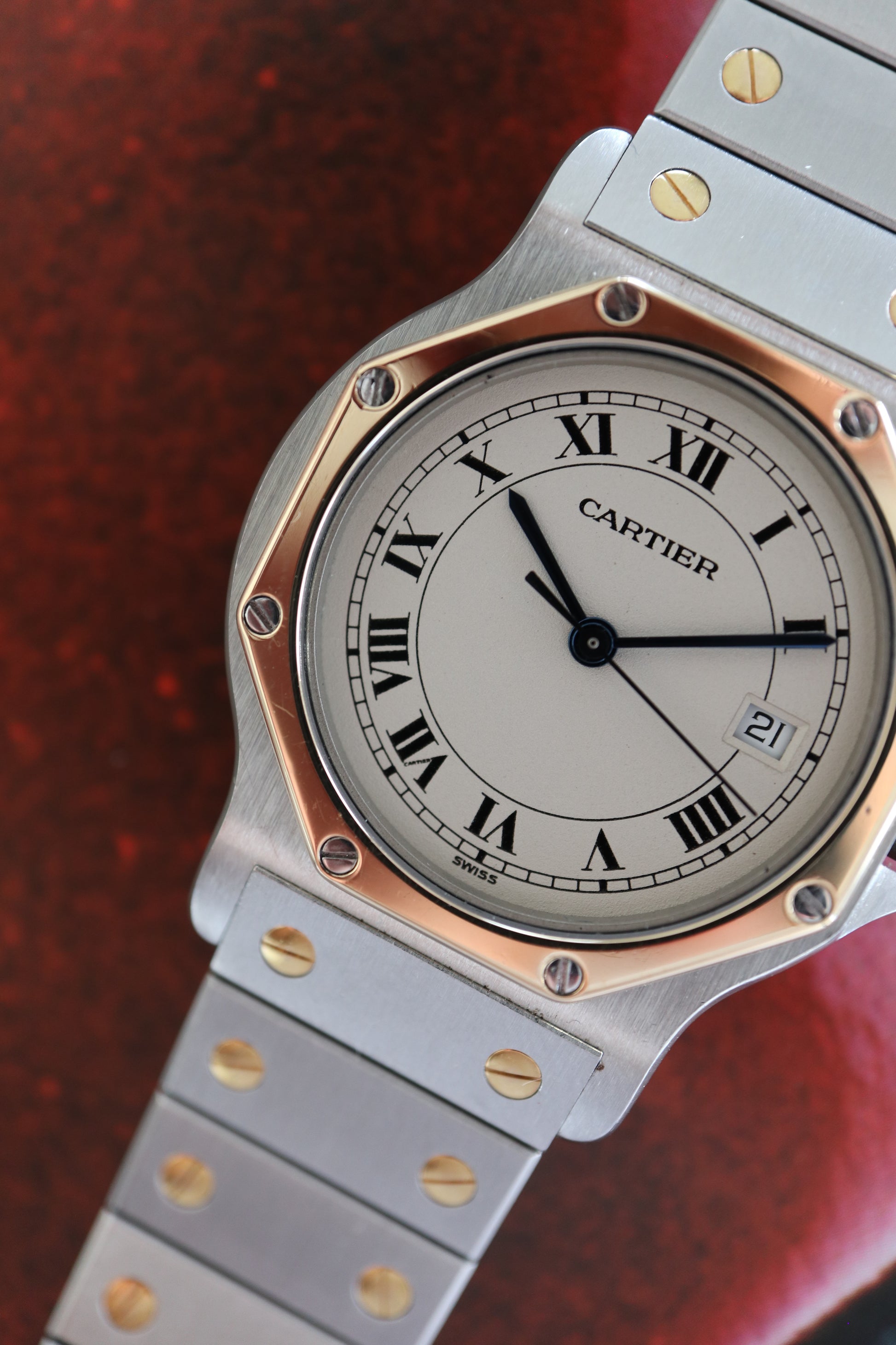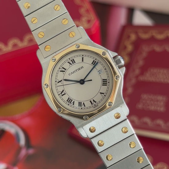 A late-period Cartier Santos Octagon LM in stainless steel with solid 18K yellow-gold bezel and screws, powered by Cartier’s quartz movement. The 30 × 38 mm case, integrated two-tone “Combi” bracelet, and crisp white Roman dial embody the distinctive geometric styling that defines the Octagon within the broader Santos family. A strong, fully sorted early-’90s example with full-set presentation.