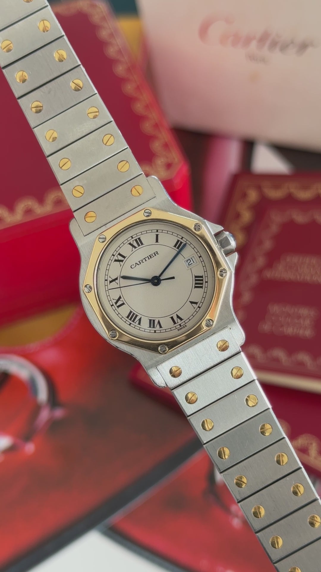 - Bracelet: Genuine integrated two-tone Santos “Combi” bracelet (fits ≈ 18 cm wrist)