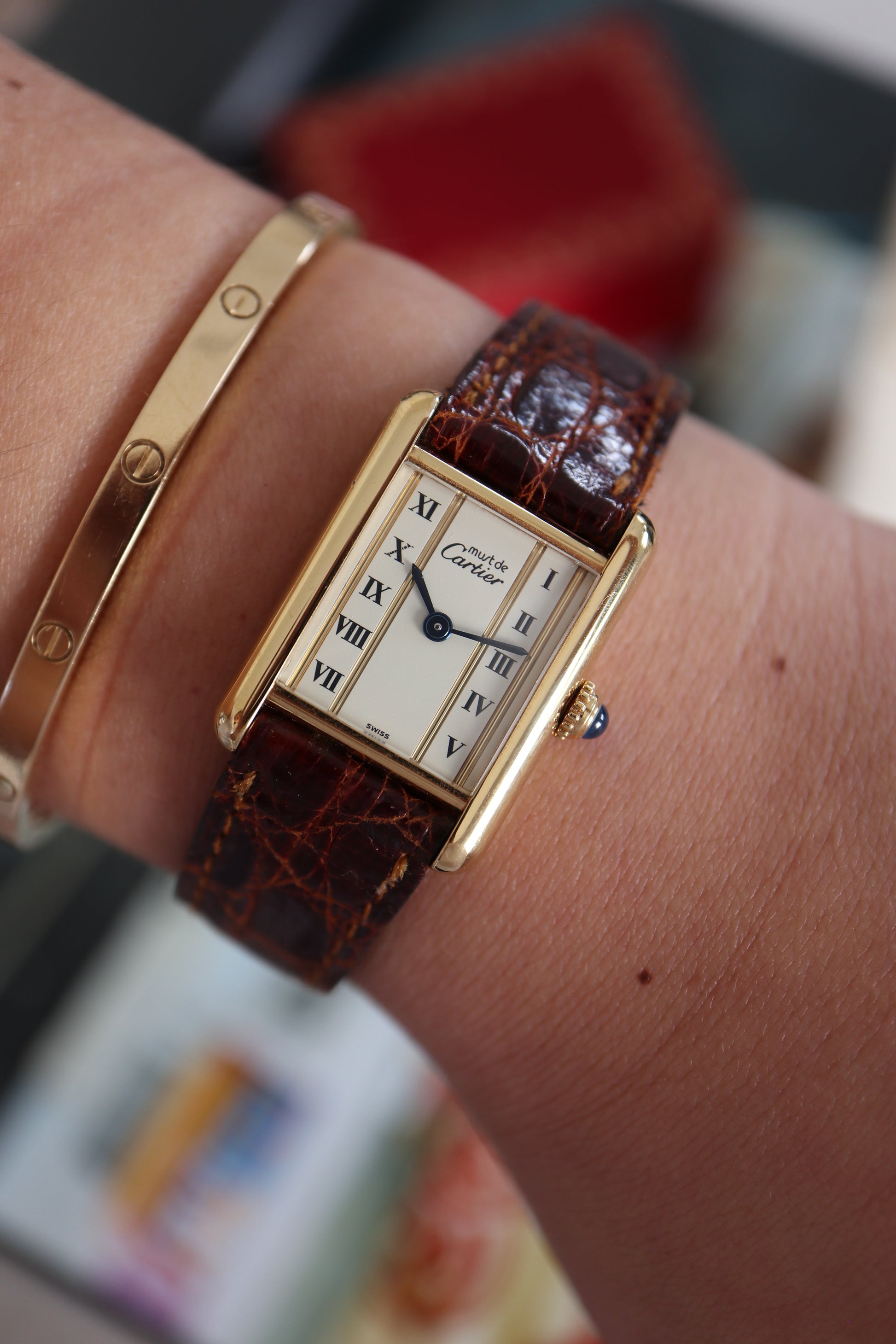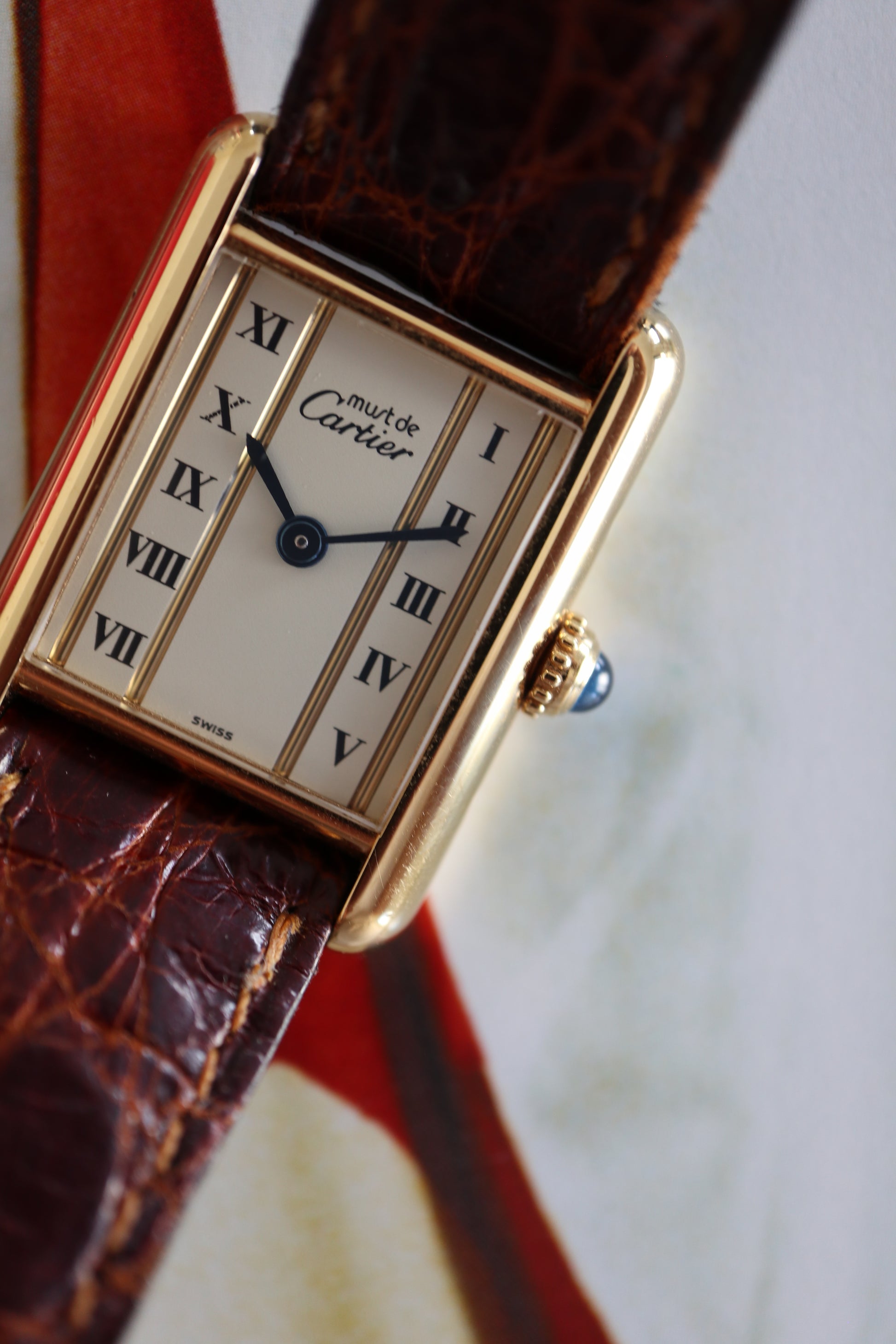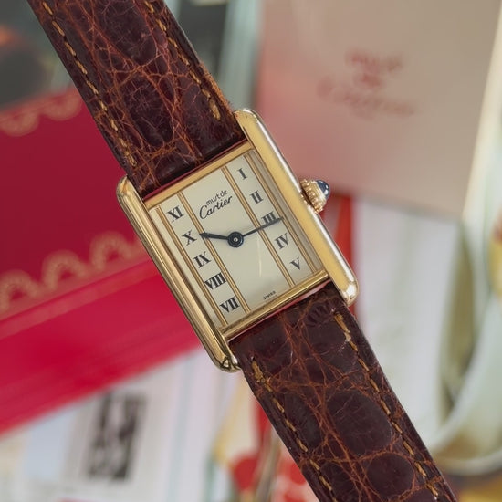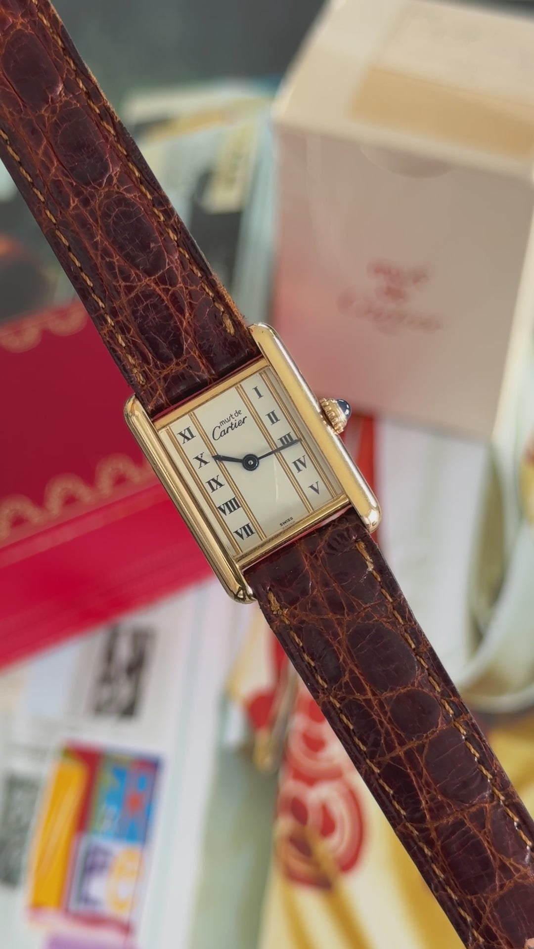 An early-1990s Must de Cartier Tank Vermeil SM in sterling silver with 20 µm gold plating, powered by the Cartier Cal. 90 quartz movement. The classic 20 × 28 mm small-model Tank case, ivory lacquer dial, blued steel hands, and cabochon crown deliver the timeless proportions that define the Must de Cartier era. A refined, highly wearable vintage Tank with original presentation.