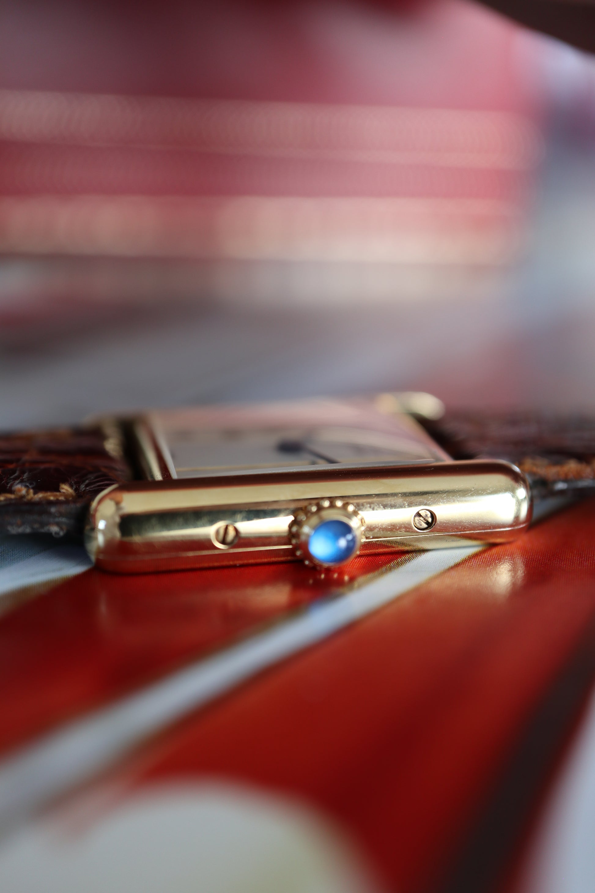 Original ivory lacquer dial remains clean and evenly aged, with crisp printed Roman numerals and intact minute track. No visible moisture damage, spotting, or evidence of refinish. Blued steel hands appear original and free from corrosion. Vermeil case (sterling silver 925 with ≈ 20 µm gold plating) shows honest, even wear consistent with age, including light softening at edges and minor thinning in high-contact areas; no evidence of aggressive polishing. Case-back engravings remain clear and legible. Correct crown fitted with intact blue cabochon. Mineral crystal presents clearly with light surface marks only. Original Cartier leather strap shows age-related wear and is fitted with a genuine Cartier gold-plated buckle.
