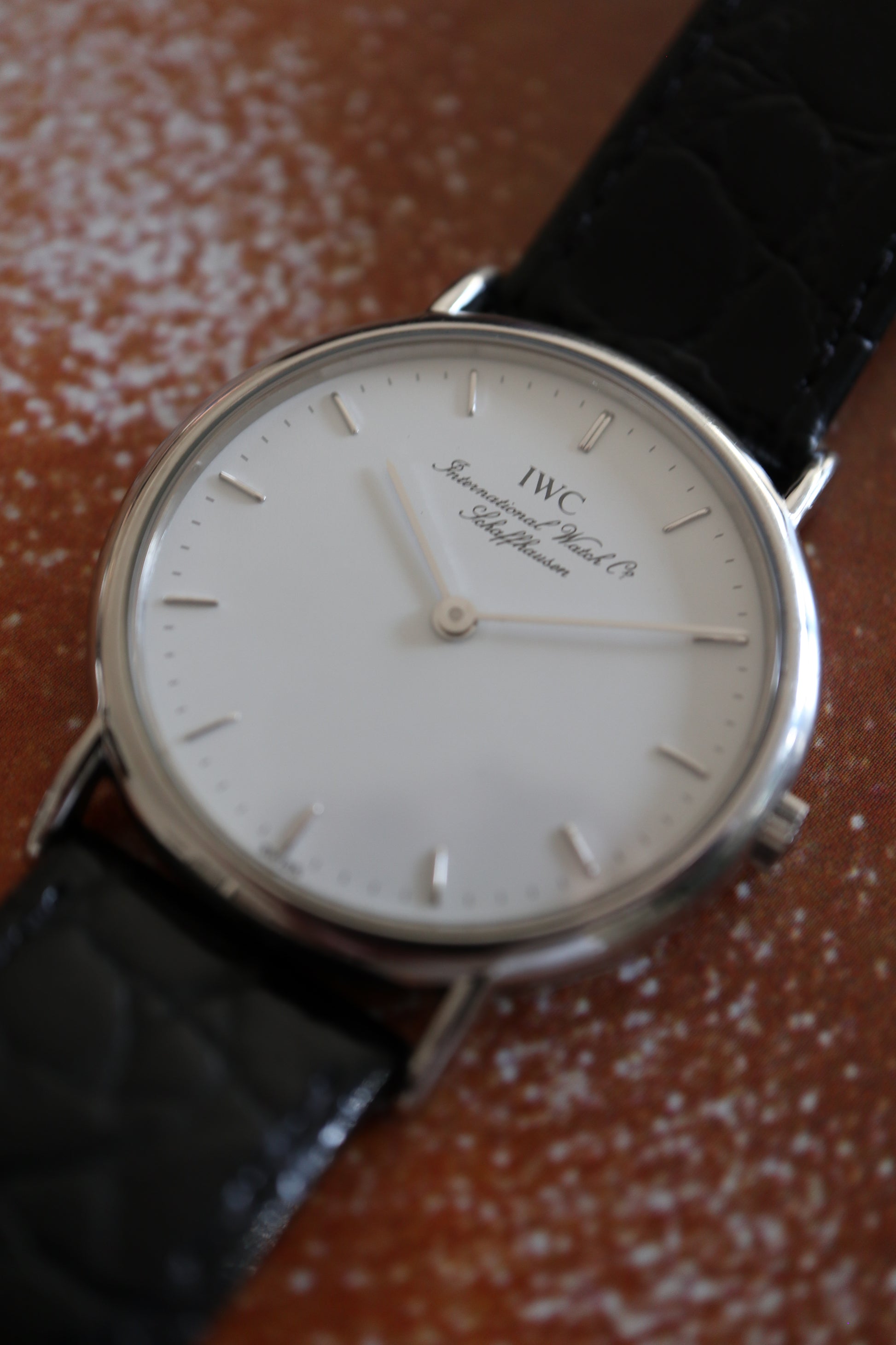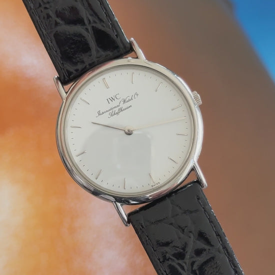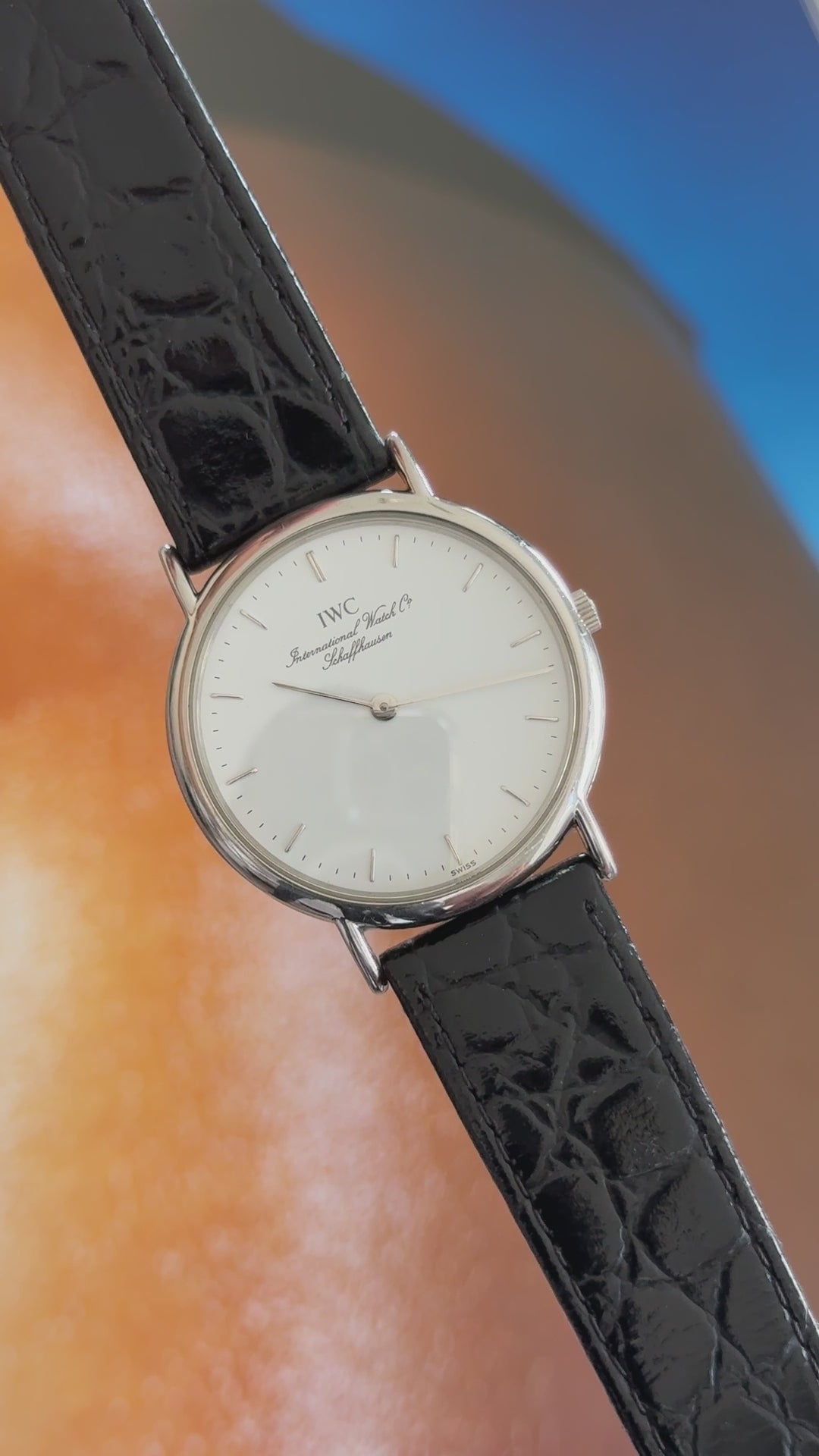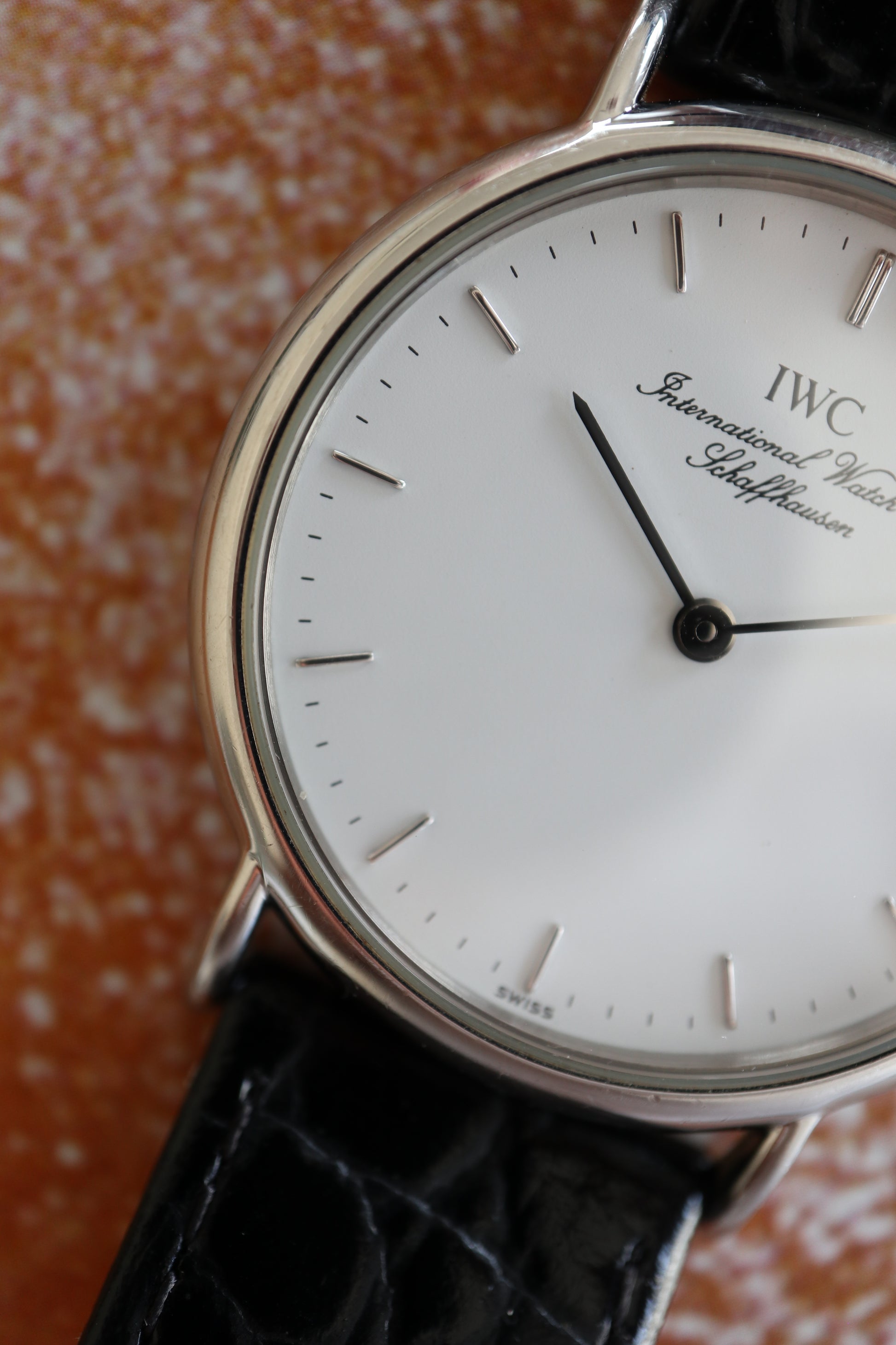 Original white dial remains clean and evenly toned with no visible spotting, moisture damage, or evidence of refinish. Applied baton indices are straight and evenly set, with crisp printed minute markers. Original dauphine hands appear correct and free from corrosion. Stainless steel case shows honest, visible surface wear throughout, including fine scratches to the bezel and case flanks consistent with age and regular use; no deep dents and no evidence of aggressive polishing, with overall case proportions retained. Case-back displays light wear with serial engraving remaining clear. Signed IWC crown present and correct. Sapphire crystal shows light surface marks only. Supplied on an aftermarket leather strap in used condition, fitted with a genuine IWC stainless steel buckle showing light wear.