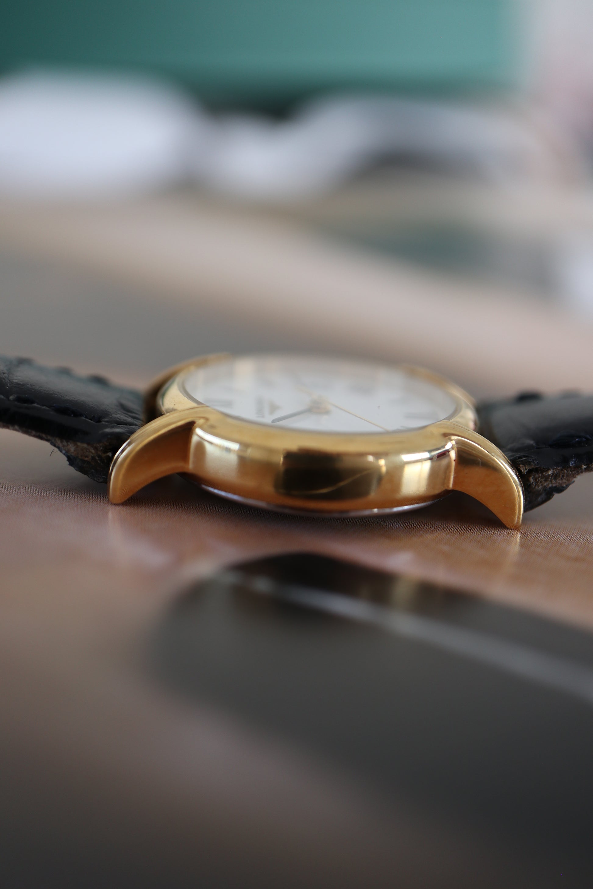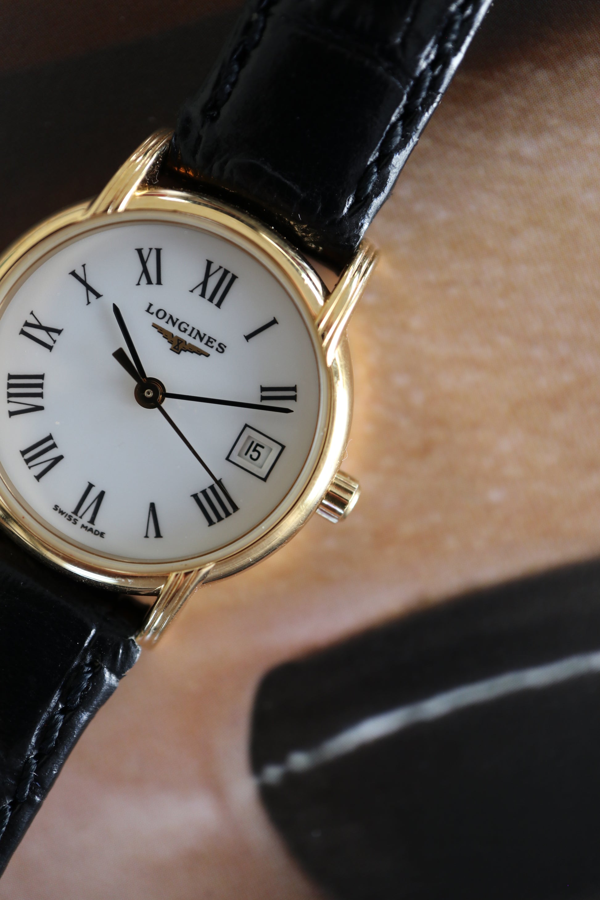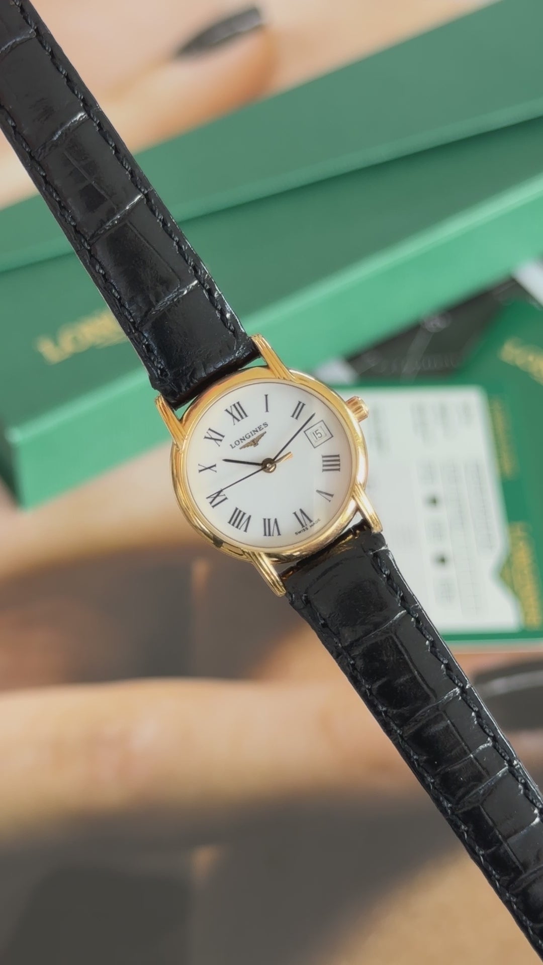 - Strap: Genuine Longines leather strap with gold-plated Longines buckle