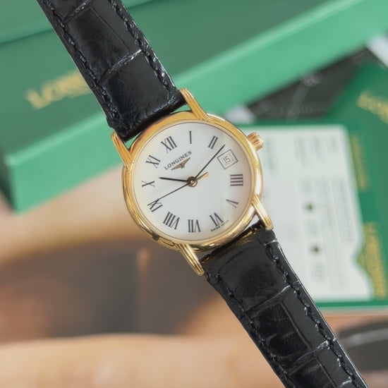 A mid-1990s Longines Présence in a compact 23mm gold-plated case, powered by a reliable Longines quartz movement. Featuring a classic white Roman numeral dial with date aperture and slim proportions, this reference reflects the refined, formal aesthetic Longines became known for in the 1990s. An elegant small-format dress watch with complete period presentation.