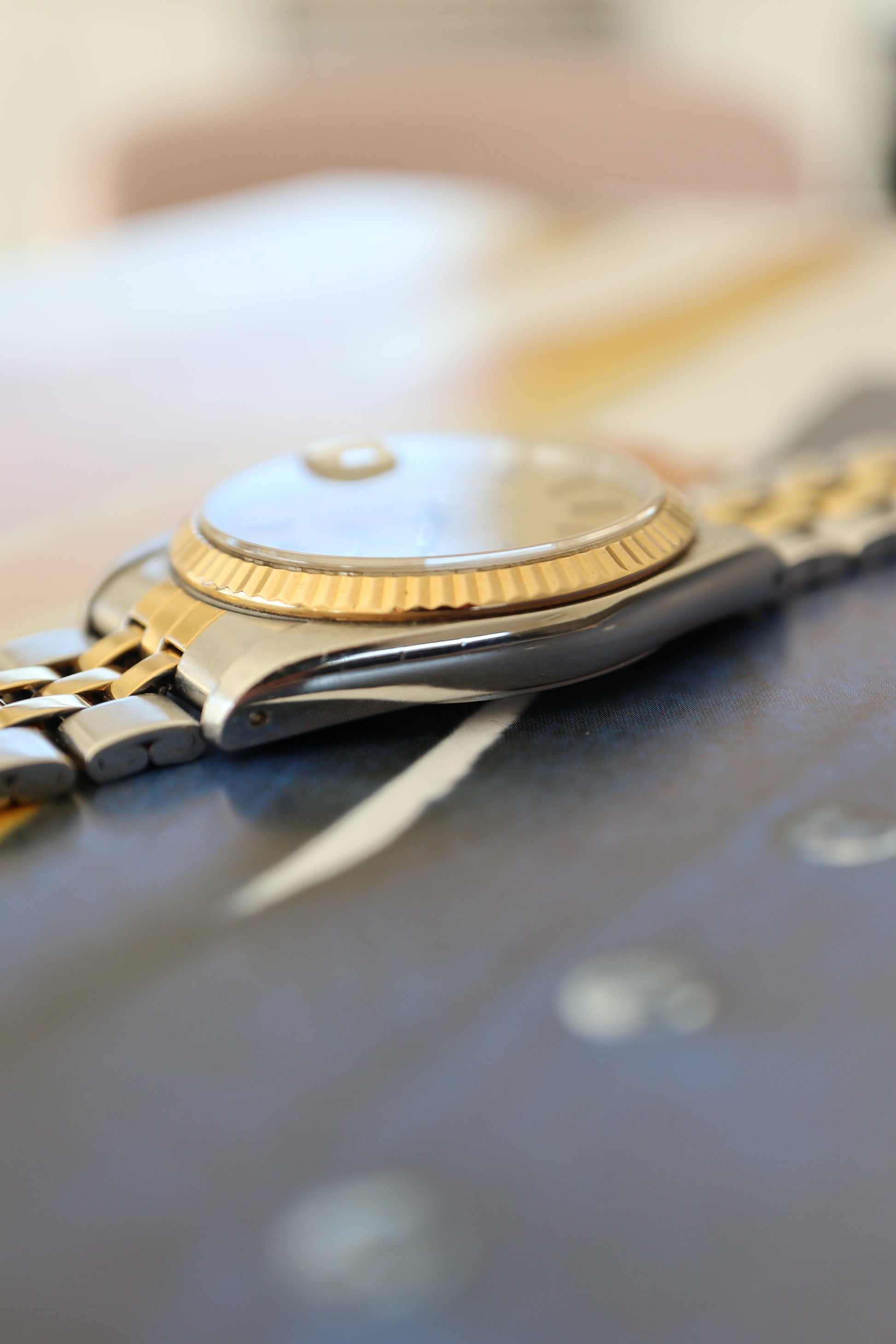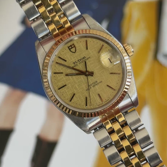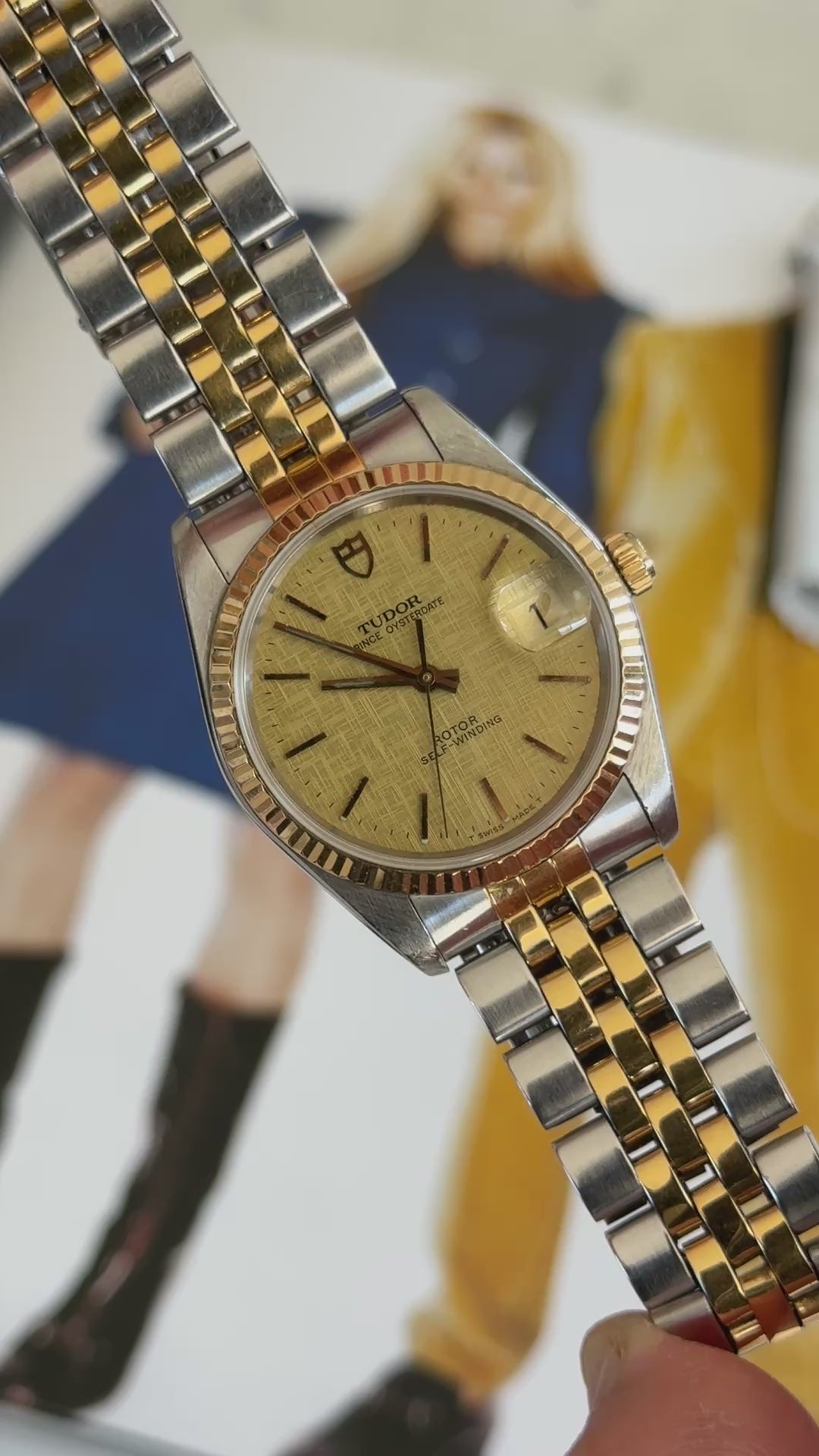 Two-tone Tudors from this period combine Rolex-built cases and crowns with Tudor’s distinctive design language. The rare linen-textured dial adds visual depth and character that sets it apart from standard champagne finishes, while the solid-gold bezel and crown elevate it beyond later plated versions. Together, these details offer an elegant, everyday-wearable expression of 1990s design and craftsmanship.